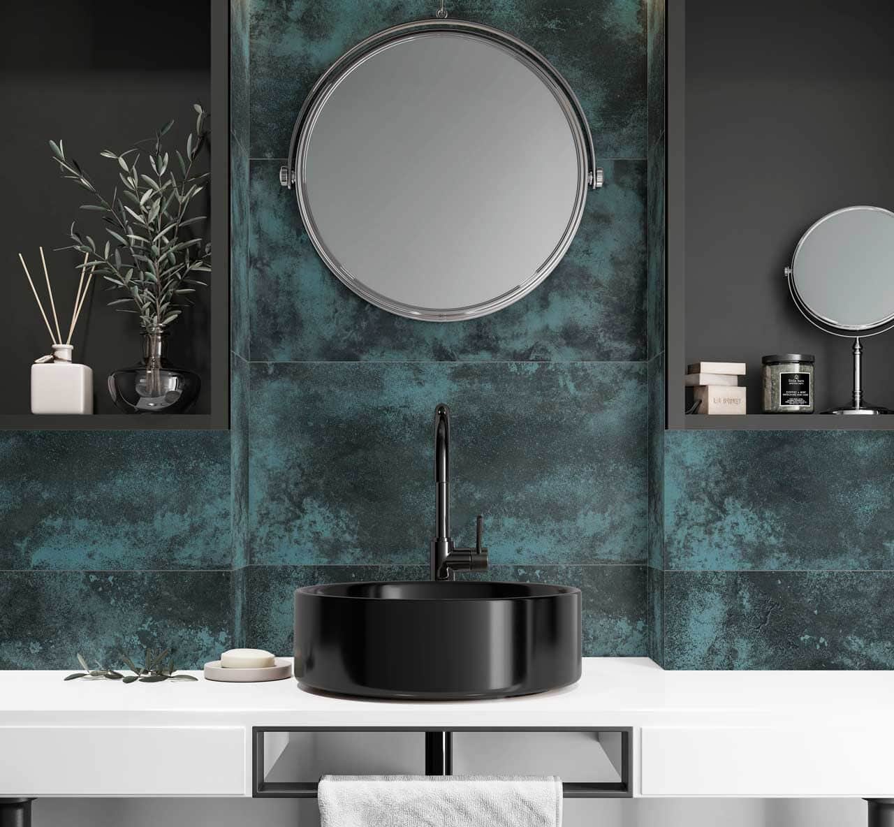Left: Bali Teal Bathroom and Kitchen Tiles from Direct Tile Warehouse | Right: Oxide Navy Blue Wall & Floor Tiles from The London Tile Co.