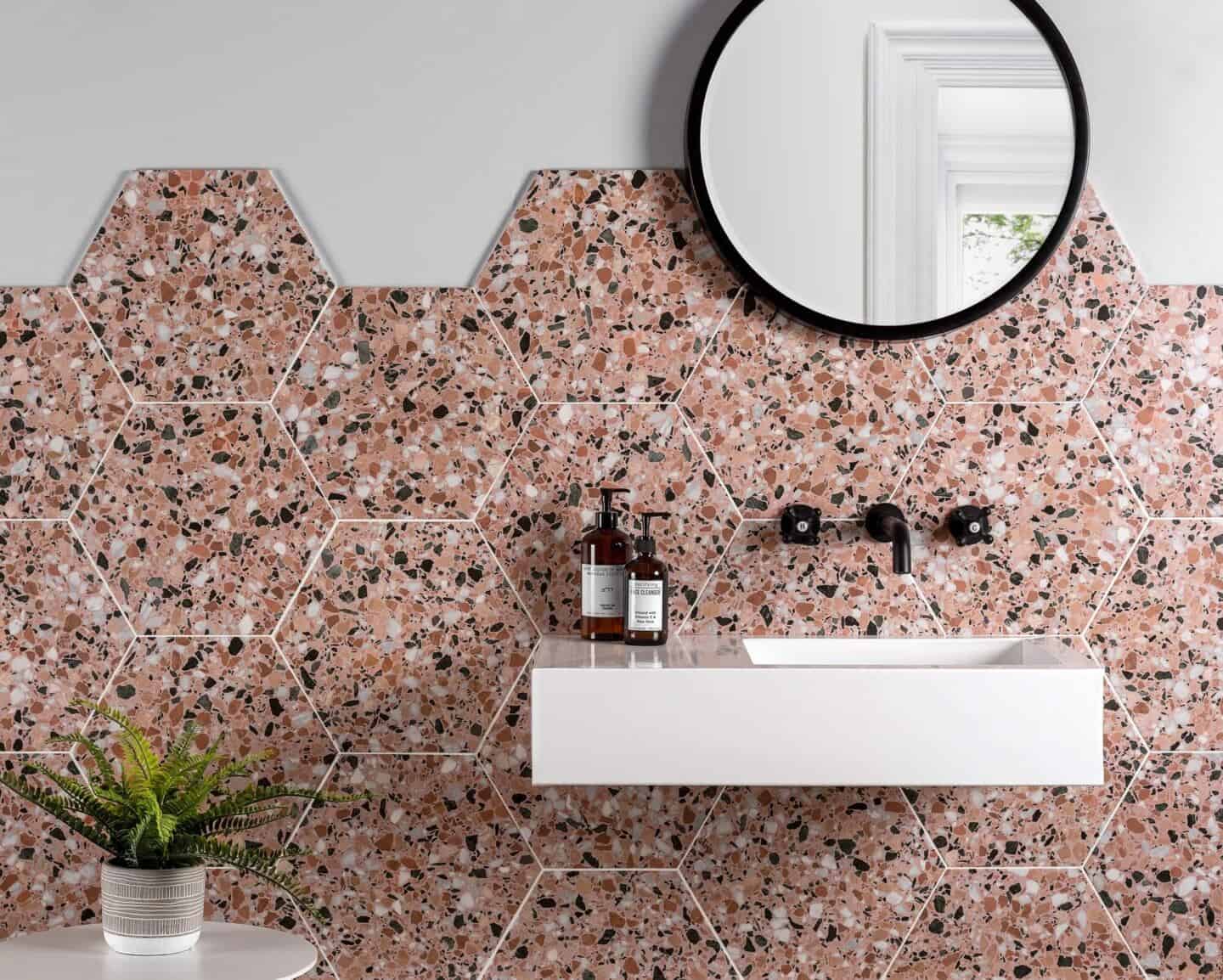 Left: Canaletto Graphite Terrazzo Effect Tiles (60x60cm) from Tile Warehouse | Right: Terrazzo Hexagon Nevada Pink Porcelain Tile from Walls and Floors