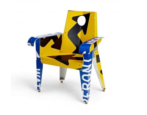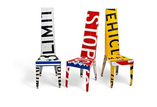 Working with scrap aluminium traffic signs Boris Bally repurposes an otherwise discarded material and transforms it into unusual, edgy and urban furniture. Bally has a background in jewellery making and grew up in an environment where recycling was somewhat of a family tradition. His so-called ‘aha moment’ came in 1991 whilst making the shell form for a fireplace from an old road sign. Whilst hammering two pieces of sign together with rivets Bally became aware of how urban, green and naughty it was to be beating up and repurposing such an authoritarian object. It was this that inspired him to blur the boundaries of art, craft and design in making his furniture collection, which he emphasizes is made from legally purchased signage. The furniture is completely hand-made or as Bally calls it ‘humanufactured’.